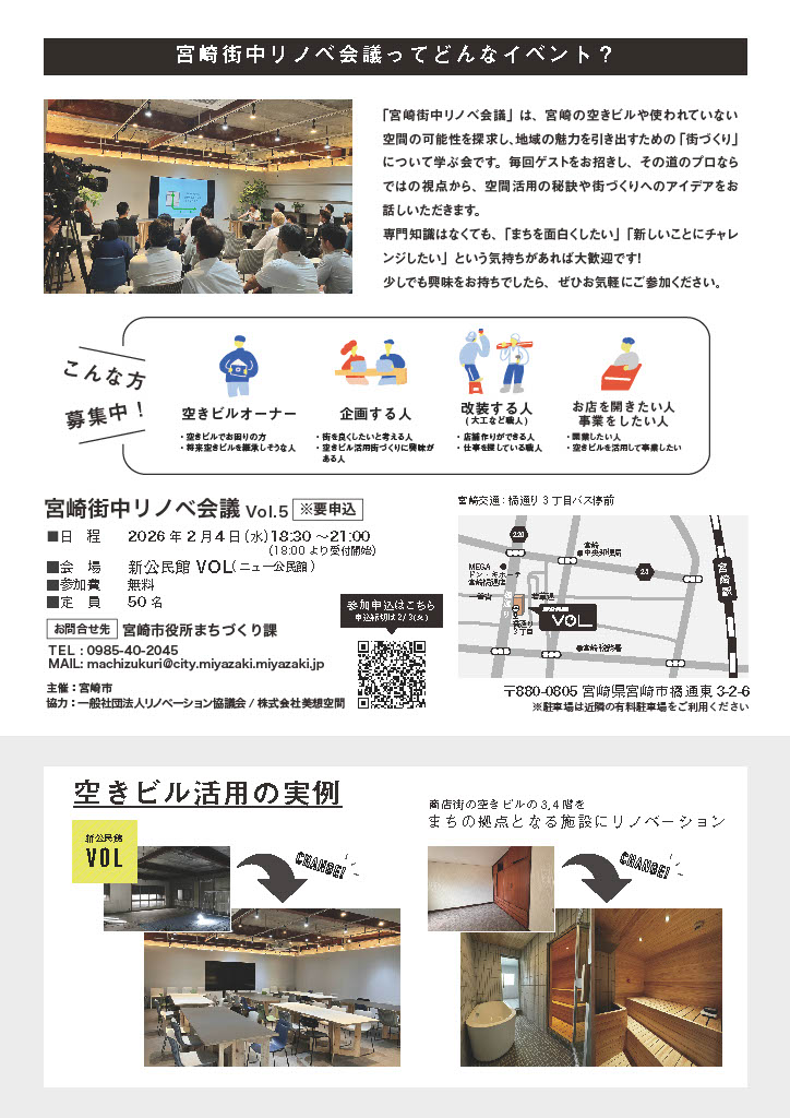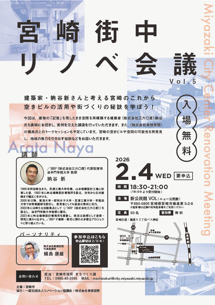 宮崎市より業務を受託いたしております「まちなか再生リノベーション促進事業」において、/360°(株式会社三六〇度)/代表取締役 納谷新 氏をお招きし、2026/2/4(水)に、宮崎街中リノベ会議vol.5を開催いたします。